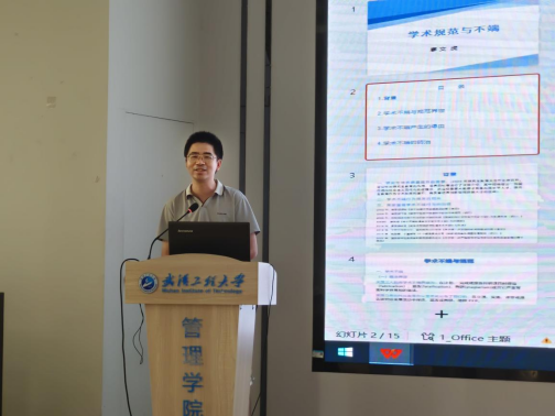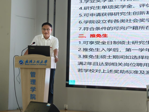 入学教育环节,学院经理闫华飞围绕培养环节、奖助体系、学位授予等方面进行了政策解读;市场营销系教师廖文虎为新生作了学术道德与学术规范方面的专题报告。