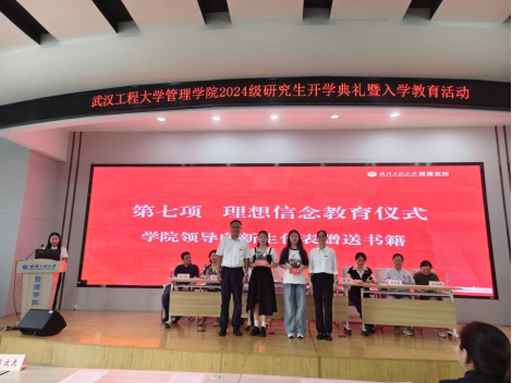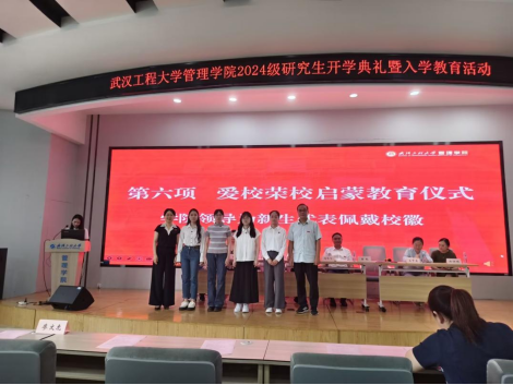 爱校荣校启蒙教育和理想信念教育环节,学院领导班子为新生代表佩戴校徽,赠送书籍。