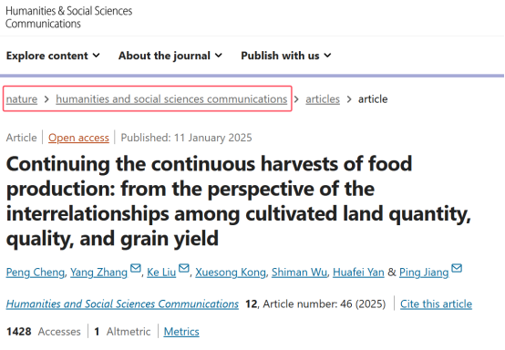 (通讯员:于怡迪)近日,公司闫华飞教授团队在Nature子刊《Humanities and Social Sciences Communications》发表题为“Continuing the continuous harvests of food production: from the perspective of the interrelationships among cultivated land quantity, quality, and grain yield”的论文。公司青年教师程鹏博士为第一作者,闫华飞教授、吴诗嫚教授为共同作者,合作单位有武汉大学、华中农业大学、首都经济贸易大学等。