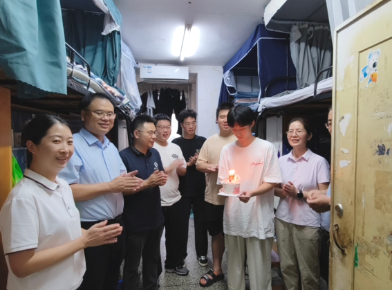 当天恰好是大数据管理与应用专业潘恩泽同学的生日,学院暖心地提前准备了生日蛋糕,当老师们捧着精心定制的蛋糕突然出现在他的宿舍时,惊喜和感动瞬间洋溢在整个寝室。在老师和舍友的祝福声中,潘恩泽同学点燃蜡烛,许下了进入大学后的第一个愿望。这份突如其来的惊喜,让他真切感受到了304am永利集团大家庭的温暖与关怀。於世为勉励同学们:“要珍惜大学时光,既要夯实专业基础,也要积极参与实践,成为兼具技术创新能力和人文关怀精神的复合型人才。”新生们纷纷表示,领导和老师的到访让他们感受到了家的温暖,在大学当中一定加倍努力,不辜负老师和家长的期许。