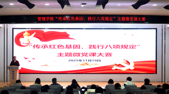 此次大赛紧扣“传承红色基因,践行八项规定”主题,以微党课为载体,让红色精神与作风建设同频共振。5组主讲人立足青年视角,深耕主题内涵,通过红色史料溯源、典型案例剖析、实践路径阐释等多元形式展开分享。有的回溯革命先辈严守纪律、艰苦奋斗的红色故事,探寻中央八项规定精神的历史渊源;有的结合新时代青年党员践行作风建设的鲜活案例,解读八项规定在校园场景中的实践密码;有的通过情景演绎、短视频展示等创新形式,让严肃的纪律教育变得生动鲜活。整场活动以“小切口”展现“大主题”,以“小故事”诠释“大精神”,让红色基因的时代价值与八项规定的实践要求深度融合,为现场师生带来了一场兼具思想性、观赏性与感染力的思想洗礼。