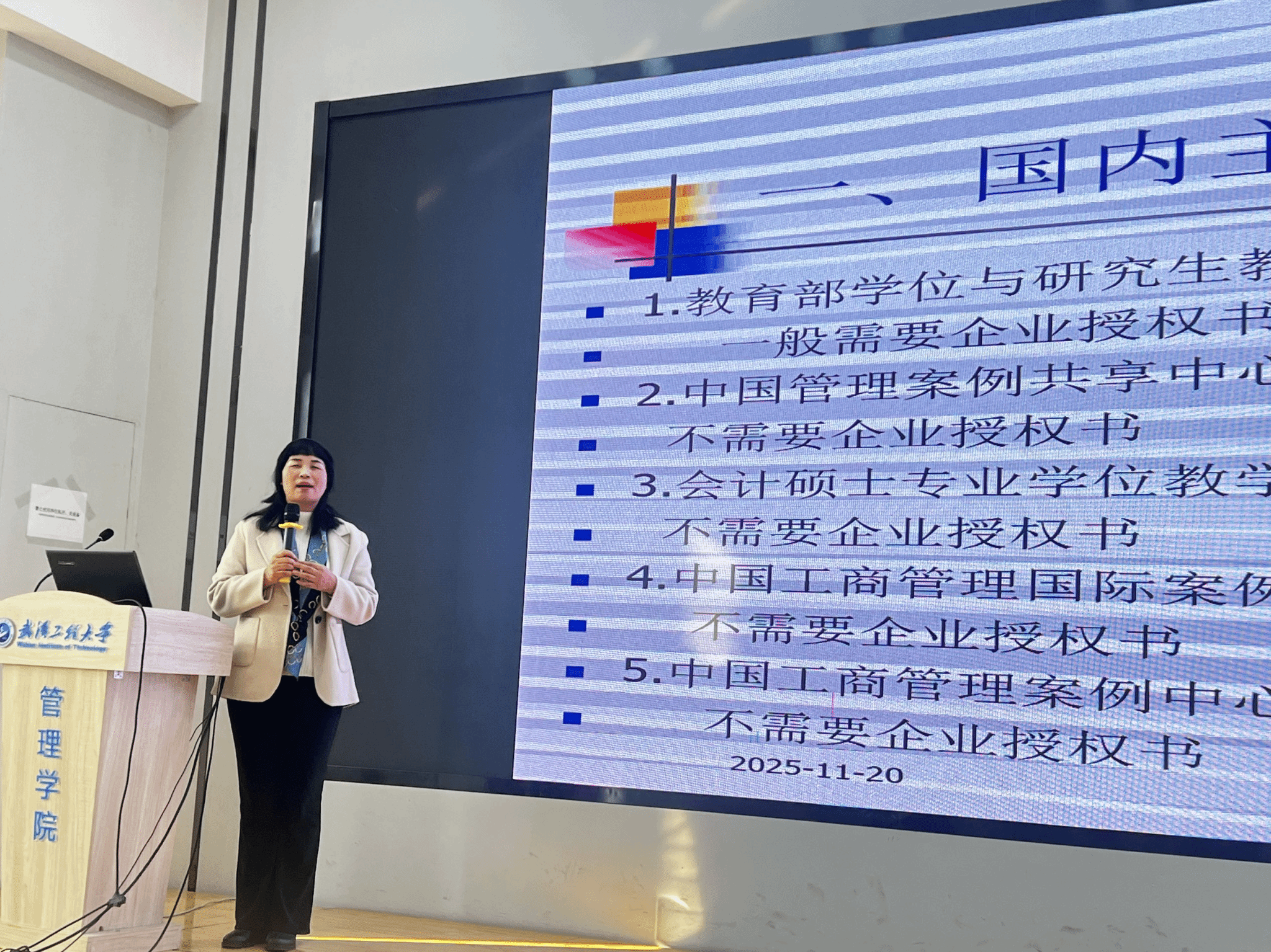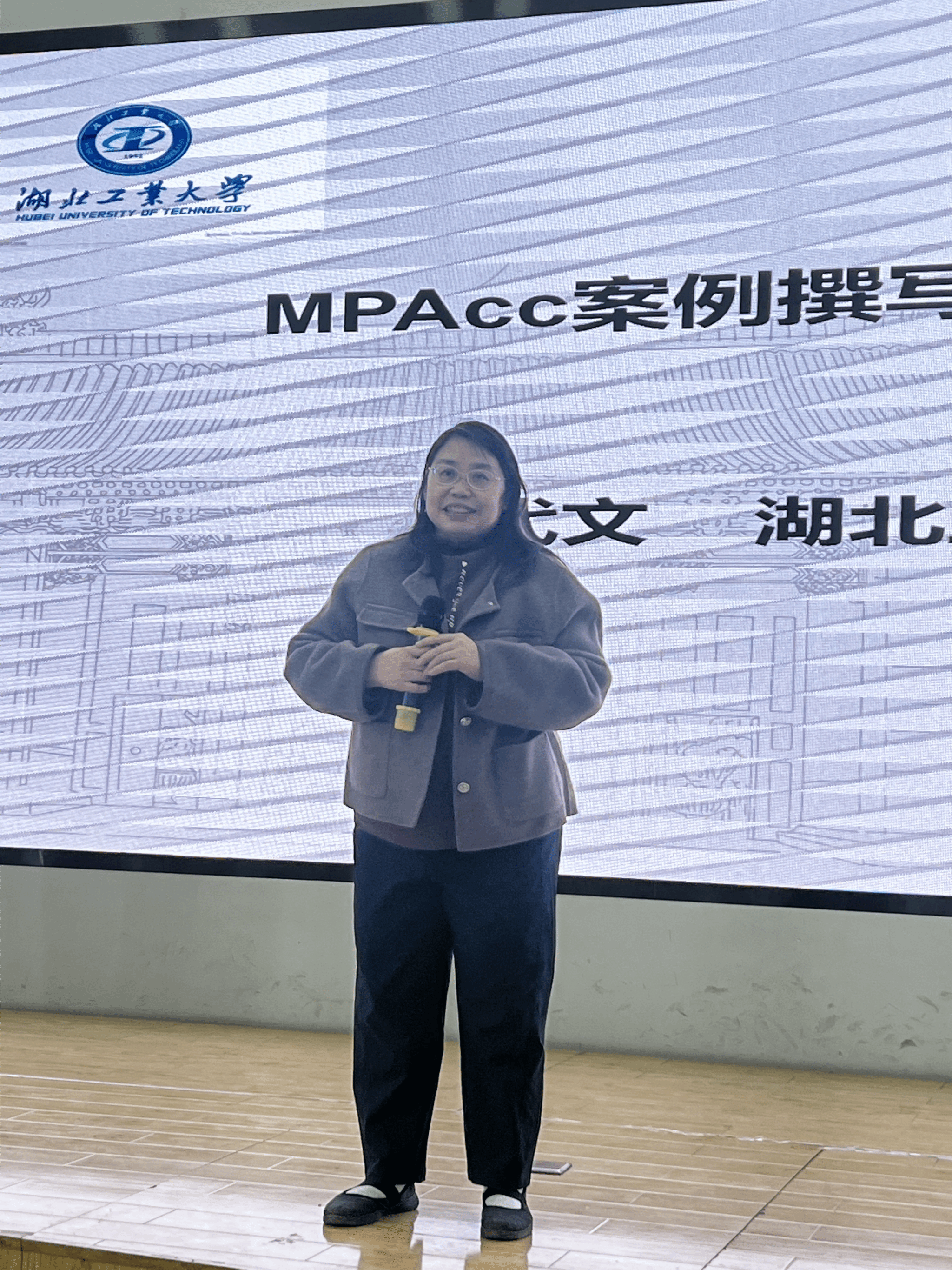 第五场由湖北工业大学会计系主任代文主讲“会计硕士专业学位教学案例撰写心得”。她通过“片仔癀轻资产转型”“海底捞人工成本管控”等6篇入库案例,剖析MPAcc案例的“数据—困境—决策”撰写框架,并就会计国家一流专业建设与师生进行深入交流。