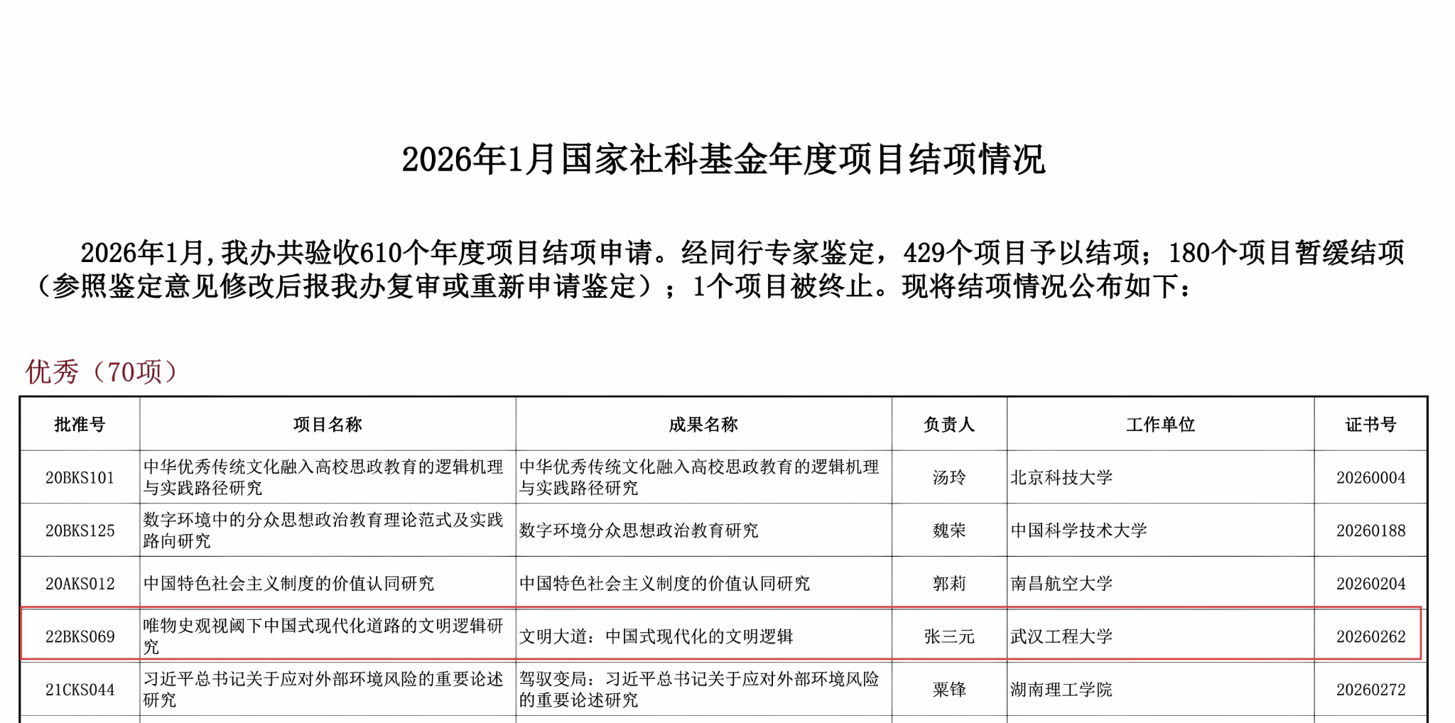 (通讯员 于怡迪 张依婷)近日,全国哲学社会科学工作办公室公布了2026年1月国家社科基金年度项目结项情况,304am永利集团张三元教授主持的国家社科基金项目“唯物史观视阈下中国式现代化道路的文明逻辑研究”顺利结项,并获评“优秀”等级。项目组成员包括肖述剑、孙虹玉、管锦绣、冯旺舟、邓欢、严敏、李义伟等青年学者。