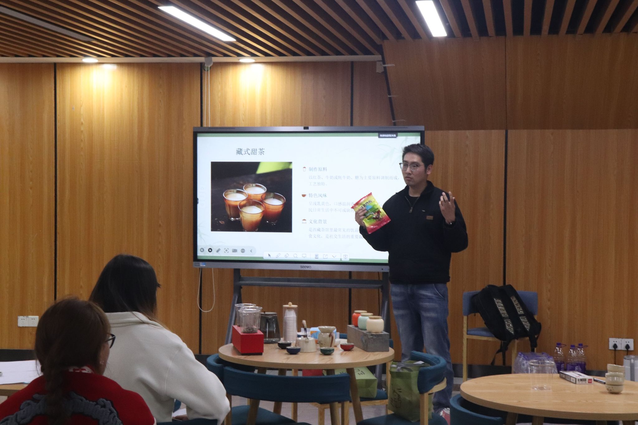 随后进入【一盏茶韵香】环节。心灵客栈办公室部长李梓涵、组织部部长叶萌及指导老师郭祥远依次登台,分别介绍了武夷红茶、铁观音、碧螺春和藏式甜茶的产地、特质与文化内涵,将茶性与人性巧妙结合,启发员工思考。