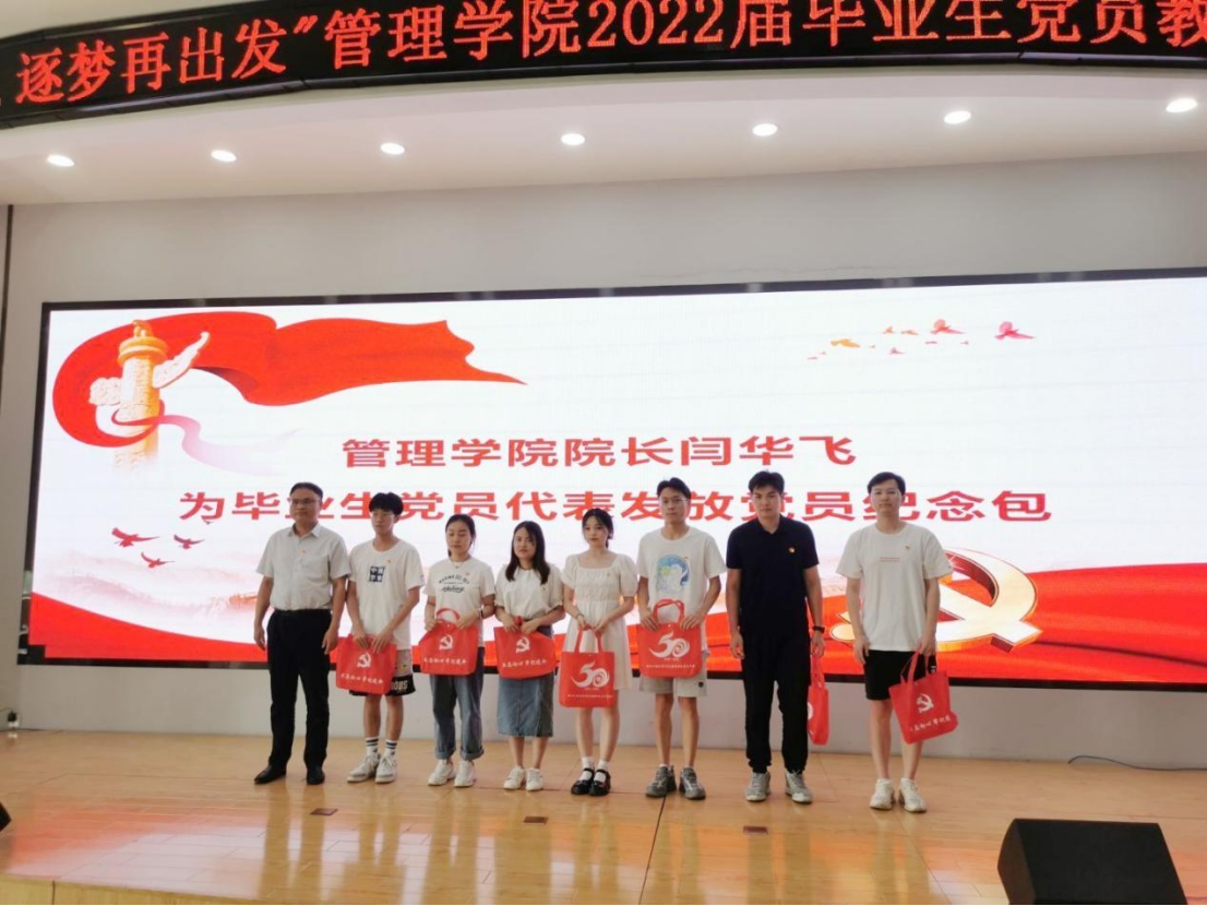 经理闫华飞为毕业生党员代表颁发“五个一”党员纪念礼包,希望大家带着母校的期许逐梦远航。一本党章是每名党员的“镜子”,在未来征程中,希望党员们经常对照这面“镜子”,查问题、找差距、知不足、寻方向;一枚党徽是党员身份的象征,在未来征程中,希望党员们戴在身上,记在心中,把党员身份亮出来、把党员形象树出来,把党员作用显出来;一杯子,一“辈子”,母校希望党员们把它带在身边,伴随左右,就像带着母校的牵挂和寄托:无论天涯海角,母校是大家永远的硬核后盾和温暖的港湾;一封信,纸短情长,一份情,幸福相伴。信中饱含祝贺、肯定、希望、期待,希望党员们永远牢记党员身份,坚定理想信念,为党旗增辉,为母校添彩;一个袋子,与党旗同色,希望党员继续秉承“格物明理 致知笃行”的校训和“不忘初心 牢记使命”的嘱托,坚守本心、不褪本色,用汗水浇灌收获,以实干笃定前行。