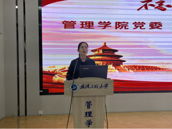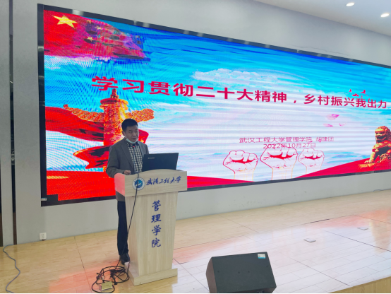 管理科学与工程系党员胡建团结合国家政策和自身科研实践,以《学习贯彻党的二十大精神,乡村振兴我出力》为题做了专题报告,他从新时代如何推动乡村振兴事业发展入手,详细讲述了在推进乡村振兴事业不断向前发展过程中党和国家所做出的艰苦努力和取得的辉煌成就,并与大家分享了两点感悟:一是做乡村建设,必须在践行乡村振兴战略基础上,真正下沉到基层一线,扎实肯干;二是要低调好学,不能高估自己的理论水平,更不能低估乡村干部的政策水平。