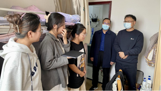 走访过程中,闫华飞详细了解同学们疫情期间的日常生活和网课学习情况,并结合当前疫情防控形势叮嘱同学们严格遵循疫情防控期间各项管理规定,按时参加学校组织的核酸检测,做好严格管控下的个人防护和自我管理,注重个人及宿舍卫生,及时通风,确保宿舍安全卫生整洁;个人也要保持积极向上的好心态,遇到困难和问题要第一时间向导师、辅导员反馈,大家一起努力,共同营造健康安全有序的良好校园环境。副经理张宗祥还关注同学们的业余兴趣发展,鼓励同学们在学习之余也要多发展个人爱好,尤其要加强身体锻炼,注重身体健康,保持积极健康的心理状态。