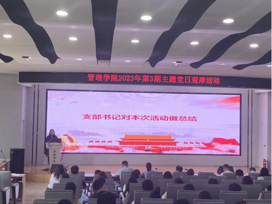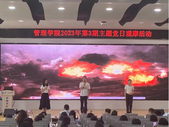(通讯员 王海澎 任思璇)为深入学习贯彻党的二十大精神,扎实推进学习贯彻习近平新时代中国特色社会主义思想主题教育,加强交流互鉴,提升主题党日质量,切实增强党支部组织力、凝聚力、战斗力。6月1日中午,学院在文科楼413报告厅开展第3期主题党日观摩活动,本次活动由研究生第三党支部主办。学院领导班子成员,各党支部书记出席并担任评委。活动由研究生第三党支部书记秦娟主持。