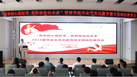 最后,左辉为全体毕业生党员上了“最后一课”。她代表全院师生为即将踏上新征程的毕业生送上祝福,祝贺大家顺利圆满毕业。她强调,今天选择这样一个主题、邀请这样一位学长、采取这样一种形式,是想让大家再回忆初心、再传承精神,从奋进中汲取力量,心怀“国之大者”、勇追“初心之光”、笃行“实干担当”、矢志“奉献社会”、厚植“爱校荣校”。接着,从管院20年前的员工和今日管院的书记双重身份的角度,对大家提出五点期望:一是与党同心,永远听党话、跟党走,奋勇猛进、担当作为;二是祖国同行,永远怀揣对祖国的热爱,立足岗位真抓实干、发光发热;三是与人民同在,永远保持同人民群众的血肉联系,时刻依靠人民、为了人民;四是与时代同向,永远与新时代同频共振,既勇于创新又脚踏实地,勇于追梦,实干圆梦;五是自己同悦,永远做真实的自己、纯粹的人,拒绝焦虑,远离内耗,永葆积极向上、开朗心态。真诚希望大家成为一个爱党的人、爱国的人、爱人民的人、勇立时代潮头的人、快乐幸福的人。最后,希望大家与母校与学院情常在、心相连,有空常回家看看,工大永远是大家的家,管院永远是大家温馨的港湾。