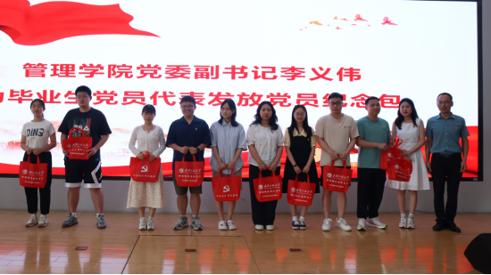 党委副书记李义伟为毕业生党员代表发放党员纪念包,希望大家带着母校的祝福和期许逐梦远航。该纪念包为学校特意为毕业党员定制,已连续发放6年。一本党章是每名党员的“镜子”,在未来征程中,希望党员们经常对照这面“镜子”,查问题、找差距、知不足、寻方向;一枚党徽是党员身份的象征,在未来征程中,希望党员们戴在身上,记在心中,把党员身份亮出来、把党员形象树出来,把党员作用显出来;一杯子,一“辈子”,希望党员们把它带在身边,伴随左右,就像带着母校的牵挂和寄托:无论天涯海角,母校是大家永远的硬核后盾和温暖的港湾;一封信,纸短情长,一份情,幸福相伴。信中饱含祝贺、肯定、希望、期待,希望党员们永远牢记党员身份,坚定理想信念,为党旗增辉,为母校添彩;一个袋子,与党旗同色,希望党员继续秉承“格物明理 致知笃行”的校训和“不忘初心 牢记使命”的嘱托,坚守本心、不褪本色,用汗水浇灌收获,以实干笃定前行。