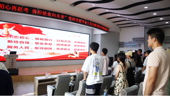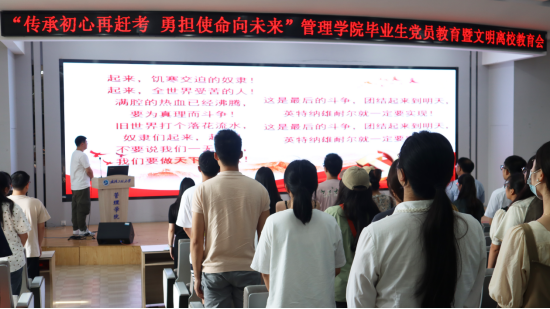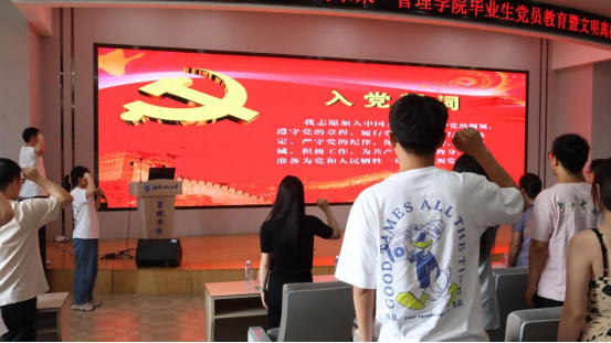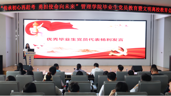 2020级研究生杨利同志代表全体毕业生党员发言。她分享了在武工大管院7年的成长经历和心路历程,回望了入党初心、表明了传承决心、坚定了奋进信心,深情表达了对党组织、对母校、对学院的感恩之情,并号召广大毕业生党员继续保持热忱之心,坚定服务人民、奉献社会的信念,勤于实践、踏实做事,用努力和成功来回报社会、回报母校。