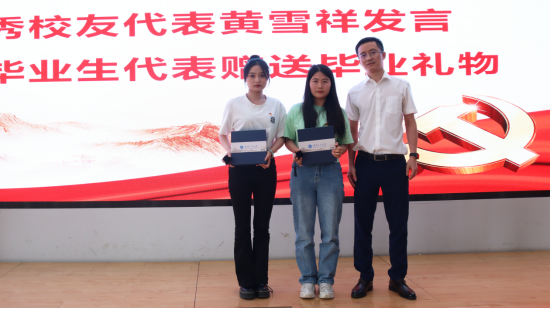 在感恩教育环节,特邀学院优秀员工2013届电子商务专业毕业生黄雪祥给毕业生做分享,他从不断完善、坚持不懈、把握机遇、感恩回馈四个方面分享了自己在学院的求学经历和毕业10年干事创业感悟。他寄语学弟学妹们要做一个懂得感恩的人,始终怀利他之心、行利他之事,要尽自己的一份力量坚持奉献社会、回报母校。今年恰逢他毕业10周年,为回馈母院,传承感恩之心,他为全体毕业生赠送了定制毕业礼物。
