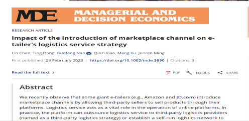 张三元教授以一作身份在《理论探讨》《思想理论教育》等期刊发表高水平CSSCI论文6篇,论文《论坚持理论创新》和《坚持自我革命:以新时代党的建设推动和引领中国式现代化》被人大复印资料《中国特色社会主义理论》全文转载并重点推介;闫华飞教授以一作身份在《长江流域资源与环境》、《软科学》等期刊发表CSSCI论文4篇;肖琴博士的论文《Analysis and assessment of risks to public safety from unmanned aerial vehicles using fault tree analysis and Bayesian network》发表在社会学领域顶刊《Technology in Society》上(中科院SCI社会学一区TOP期刊,IF=9.2);封亦代博士的论文《Does new-type urbanization policy promote green energy efficiency? Evidence from a quasi-natural experiment in China》发表在经济学国际知名期刊《Energy economics》上(JCR的SSCI经济学一区TOP期刊,IF=12.8);徐萌博士的论文《Environment and health co-benefits of vehicle emission control policy in Hubei, China》发表在交通领域权威期刊《Transportation Research Part D》上(JCR的SSCI交通学一区,IF=7.04);陈林博士发表在管理领域权威期刊《Managerial and Decision Economics》上的论文《Impact of the introduction of marketplace channel on e-tailer’s logistics service strategy》入选ESI高被引论文。