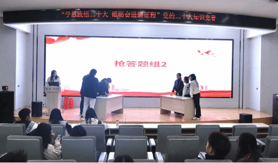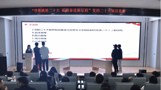 本次竞赛围绕党的二十大精神、时事政治等相关内容展开,共设置必答题、抢答题两个环节,题量丰富、涉及知识面广,全方位考察了参赛同学们对于党的二十大精神的理解和掌握程度。29支参赛队伍按顺序依次上台,面对不同类型的题目,选手们冷静思考、自信作答,充分展示出管院学子比学赶超的争先劲头。