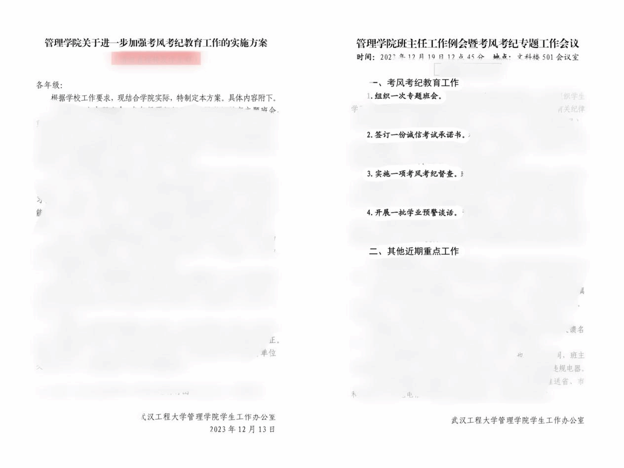 召开一次专题会议。结合学校工作要求和学院实际,第一时间制定考风考纪专项实施方案,召开学工例会和全院考风考纪专题会议,布置重点工作,提出细化要求,进一步明确责任人、路线图和时间表,高位推动各年级、各班级迅速落实落细,形成联动互促机制。