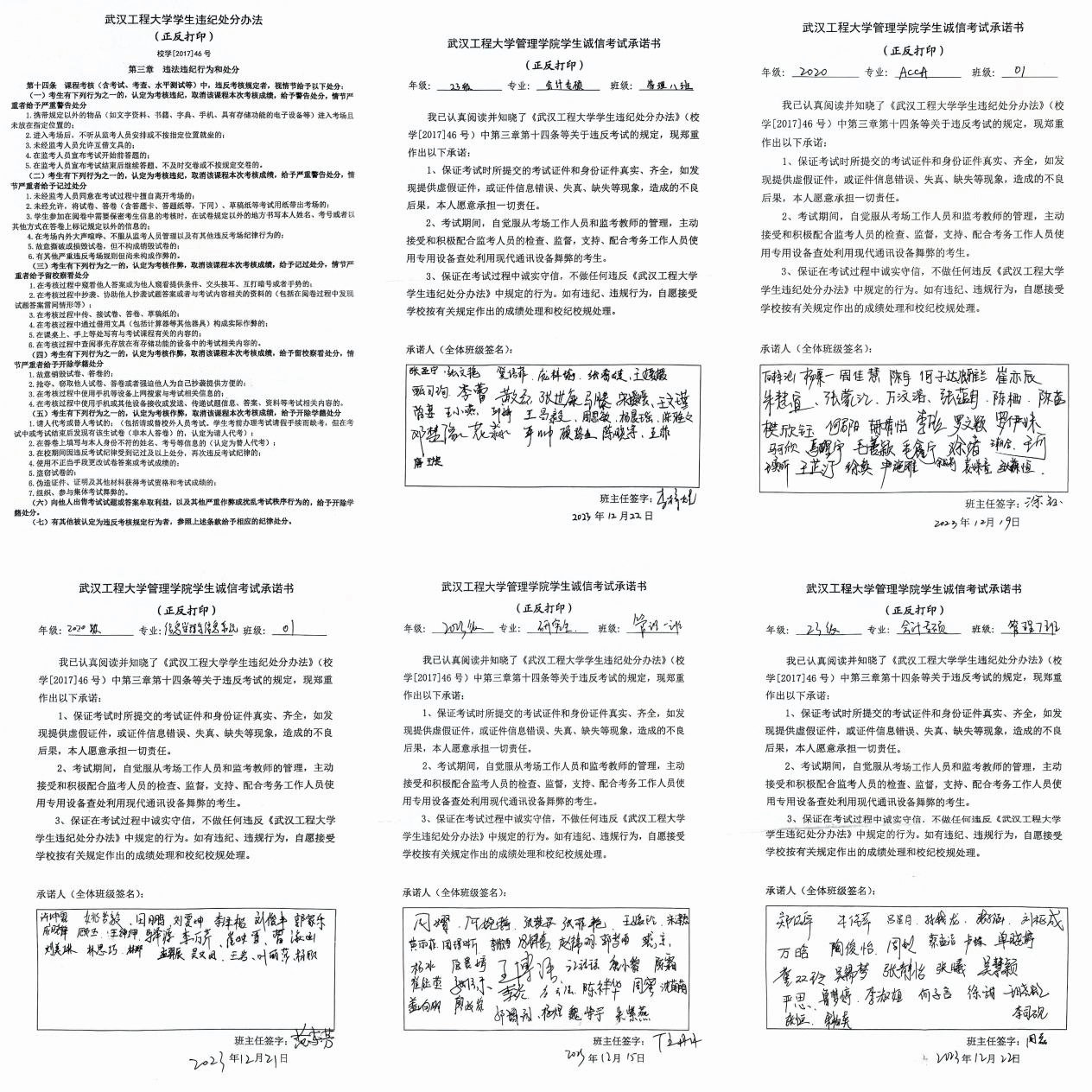 共签一份诚信承诺书。班主任、班干部领读国家有关条例和学校《员工违纪处分办法》,班级同学集体诵读,组织集中签订,加强考前教育、考中监督和考后通报,强化员工诚信考试意识,实现全员覆盖、全体知晓,做到立诚于心、树信于行,让每个考生讲诚信、守规矩、遵法纪。