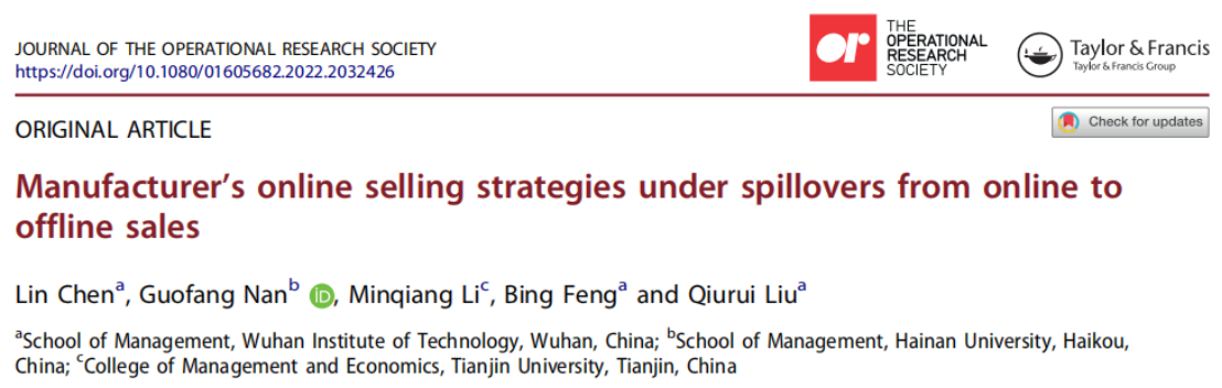 近日,304am永利集团陈林博士在管理科学国际重要期刊《Journal of the Operational Research Society》上发表了重要论文成果:“Manufacturer’s online selling strategies under spillovers from online to offline sales”。