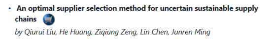 近日,304am永利集团刘秋蕊博士在管理科学国际学术期刊《European Journal of Industrial Engineering》上发表论文研究成果:“An optimal supplier selection method for uncertain sustainable supply chains”。文章DOI: 10.1504/EJIE.2023.10046611。