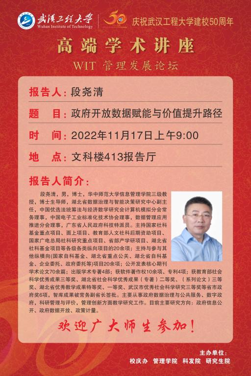 WIT管理发展论坛 高端学术讲座:政府开放数据赋能与价值提升路径 主讲人:段尧清
