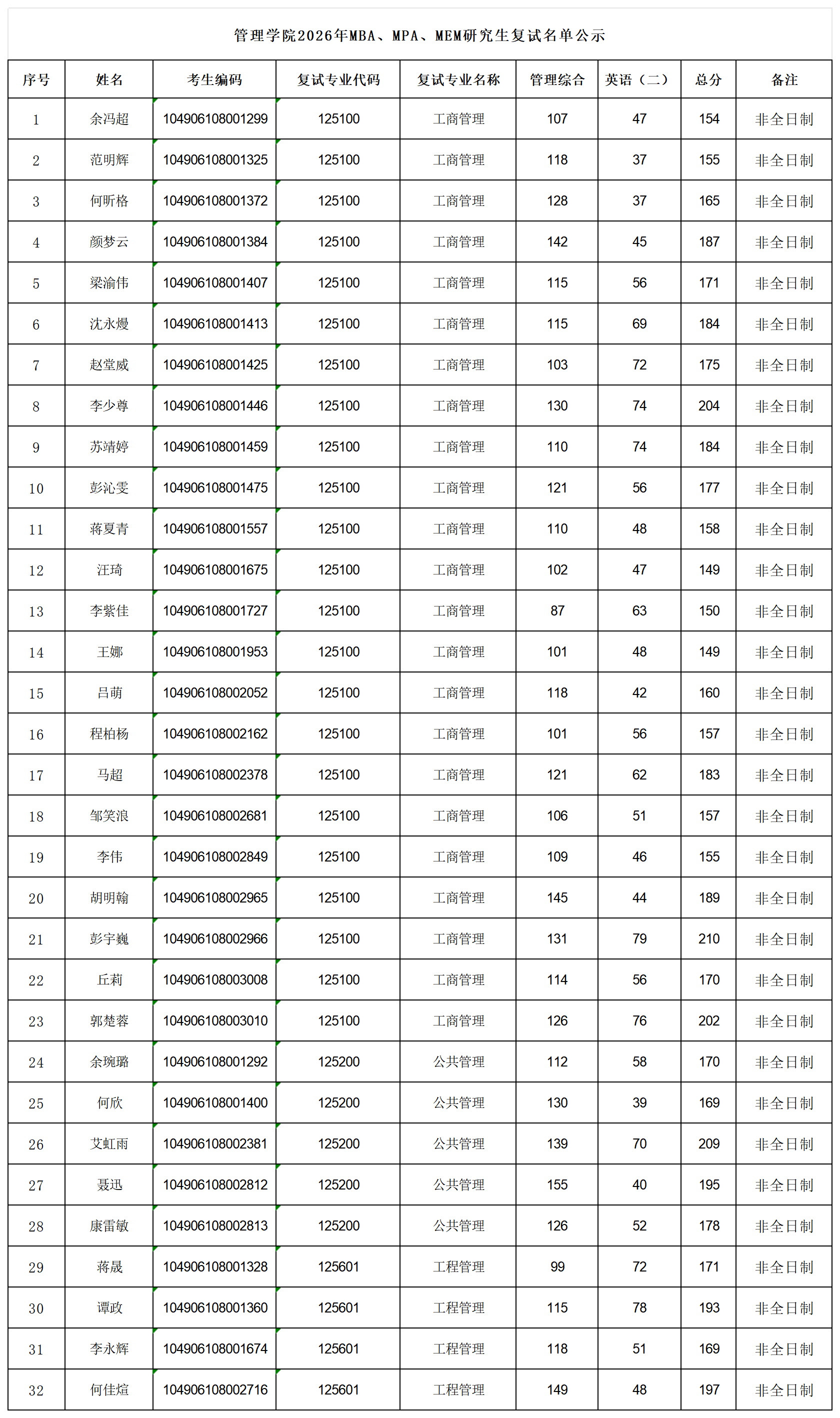 304am永利集团2026年MBA、MPA、MEM研究生复试名单公示