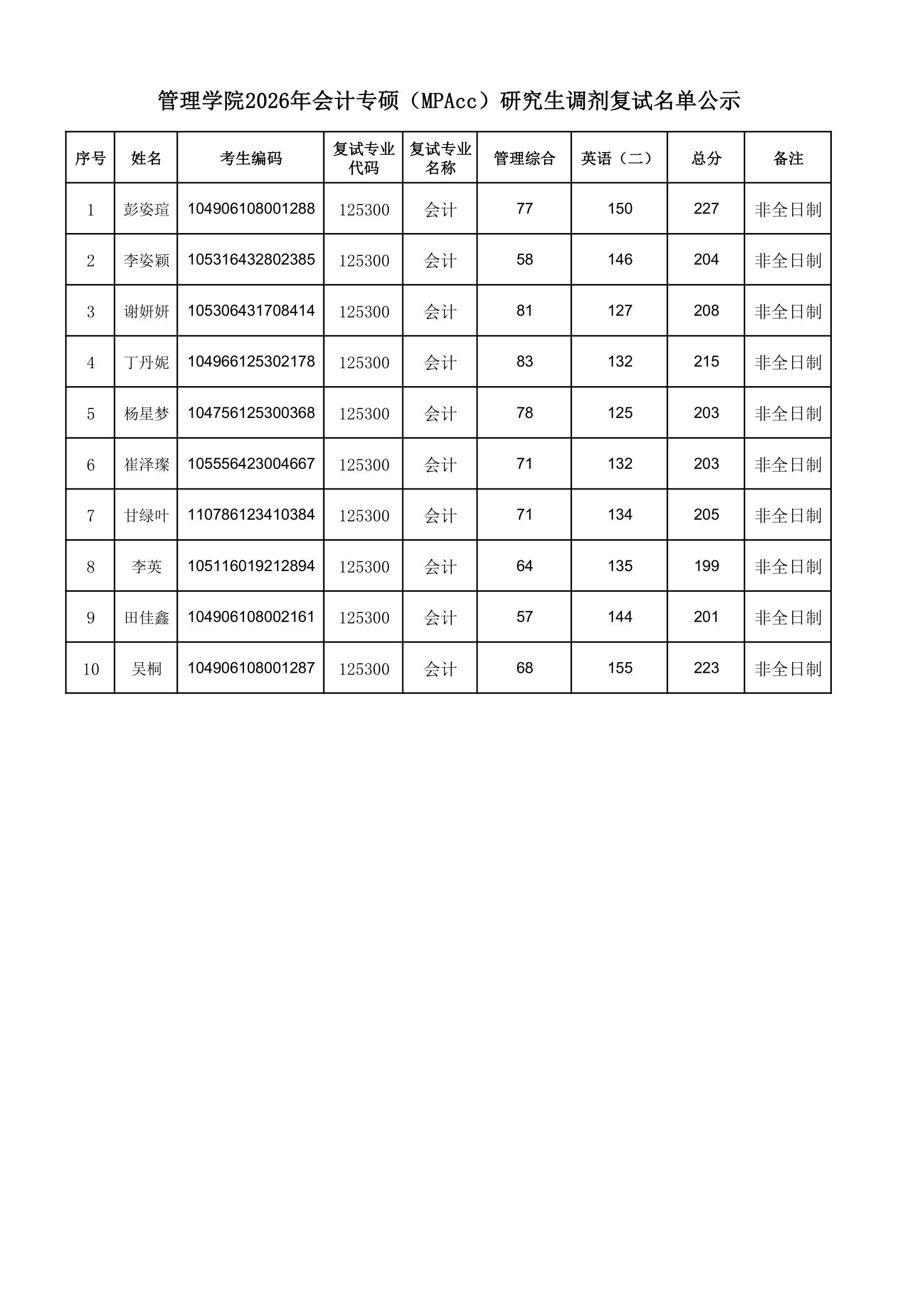 304am永利集团2026年会计专硕(MPAcc)研究生调剂复试名单公示